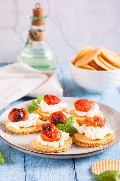 Брускетта на хрустящих хлебцах с рикоттой и запеченными помидорами на тарелке на столе, вертикальный вид