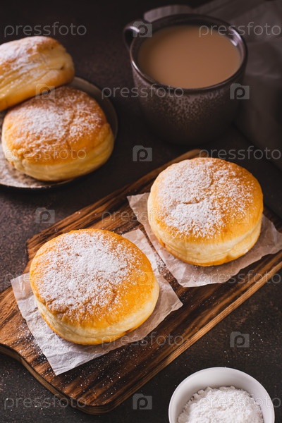 Свежие пончики с сахарной пудрой и сладкой начинкой на тарелке на столе, вертикальный вид