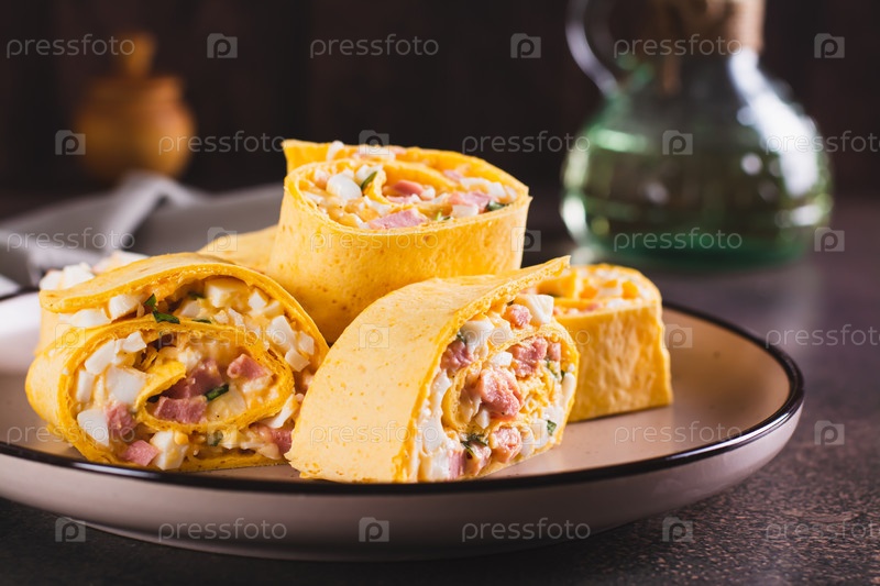 Рулетики из тортильи с салатом из сосисок, яиц, сыра и трав на тарелке