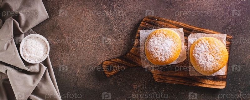 Свежие пончики с сахарной пудрой и сладкой начинкой на тарелке на столе, вид веб-баннера