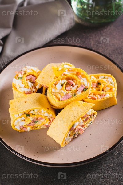 Мини-рулеты из тортильи с нарезанными сосисками, сыром, яйцами и зеленью на тарелке, вертикальный вид
