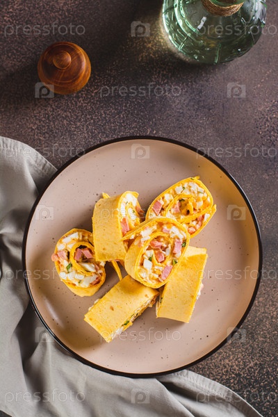 Мини-рулеты из тортильи с нарезанными сосисками, сыром, яйцами и зеленью на тарелке и вертикальный вид