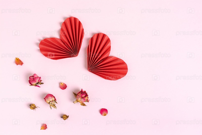 Пара сложенных красных бумажных сердечек и увядающих цветов на розовом фоне