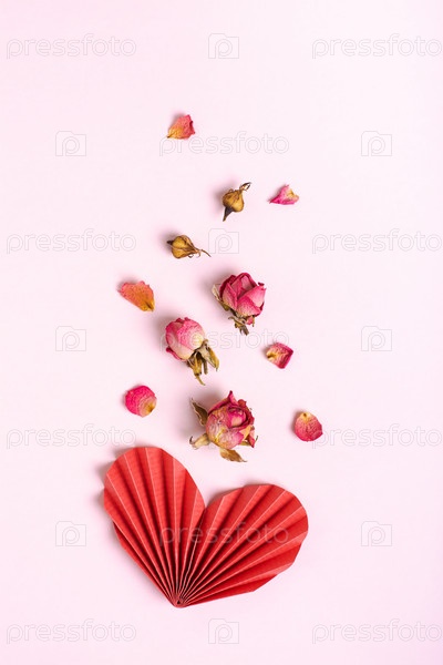 Сложенное красное бумажное сердце и сухие цветы на розовом фоне, вертикальный вид