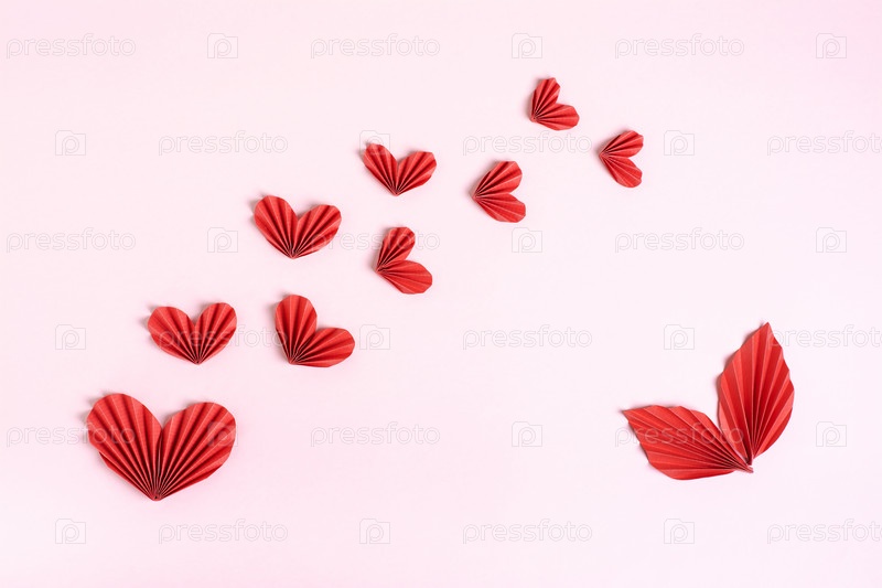 Композиция из сложенных красных бумажных сердечек и листьев на розовом фоне, вид сверху