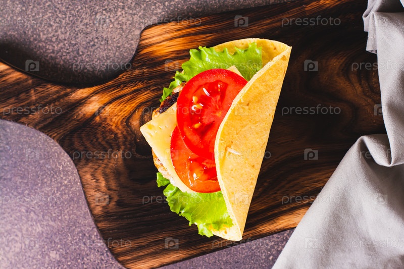 Крупный план тако-бургера с котлетой, сыром и помидорами на доске на столе