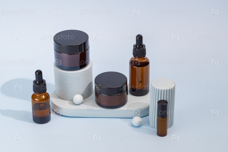Набор косметических средств в упаковке из янтарного стекла. Косметическое масло в стеклянной бутылке-капельнице и банке из янтарного стекла с дневным кремом для здоровой и молодой кожи. Небрендовая упаковка для продвижения косметики