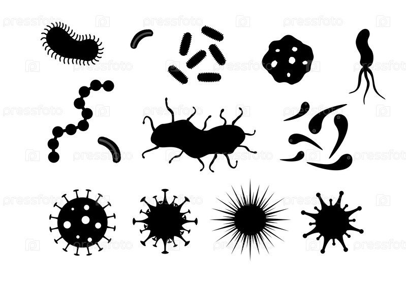 Вирусы и бактерии на белом фоне. Пандемия, биологическая опасность. COVID-19. Черные силуэты. Векторная иллюстрация