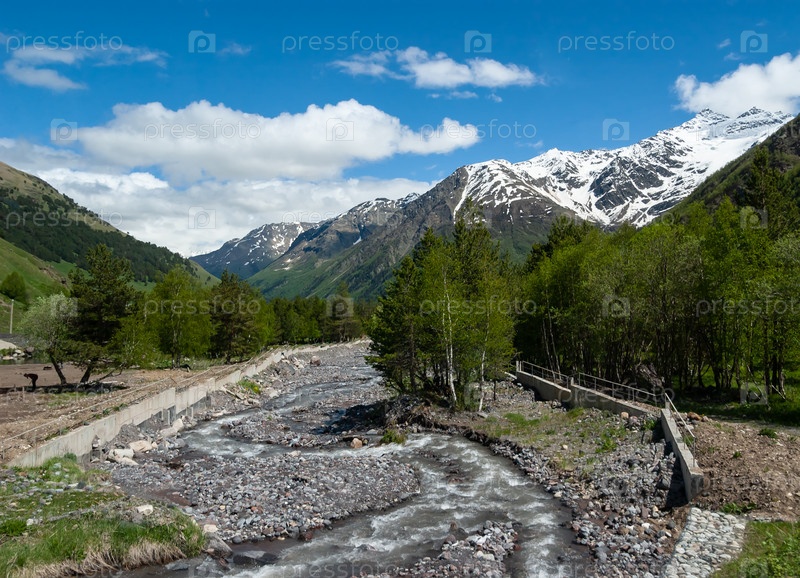 Каменистая река Баксан, сосны и березы на берегу, заснеженные горы и скалы. Дорога к Эльбрусу. Баксанское ущелье, поселок Тегенекли, Россия
