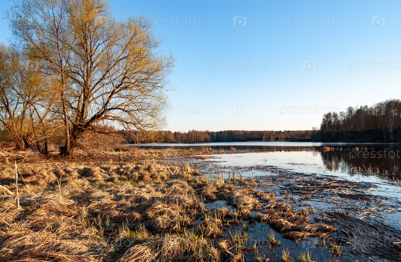Болотистый берег реки. Кочки с желтой травой и камышом, большая ива. Река Ильд, деревня Пропасть, Ярославская область, Россия, Россия