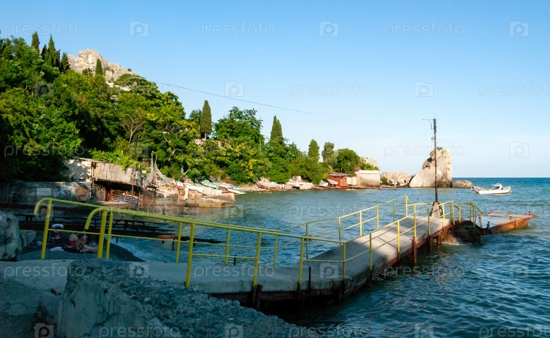 Пристань для лодок и катамаранов в небольшой морской бухте. Гурзуф, Крым