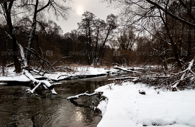 Река в лесу, контраст черной воды и белого снега. Московская область, Россия