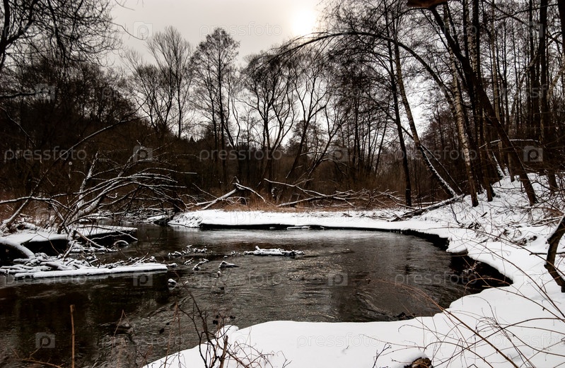 Река в лесу, хаос ветвей упавших деревьев на берегу. Московская область, Россия