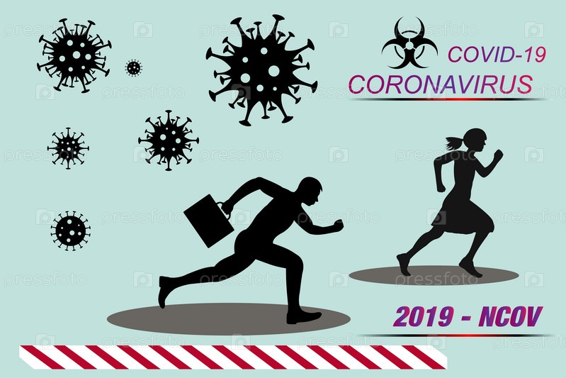 Концепция защиты от вирусов. Мужской силуэт мужчины с мечом и щитом в руке отражает атаку коронавирусных бактерий. Пандемия, биологическая опасность. COVID-19