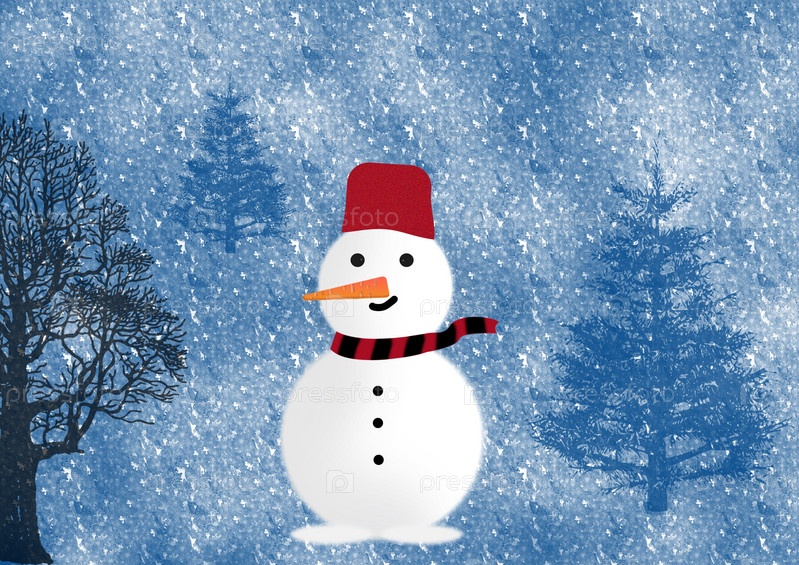 Снеговик в зимнем лесу. Иллюстрация на абстрактном фоне