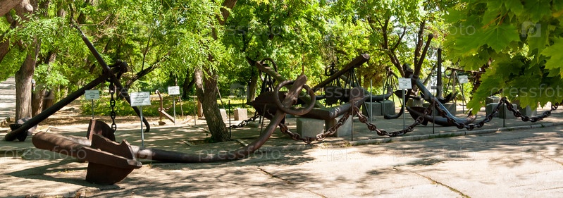 Экспозиция старинных якорей военных кораблей у здания Панорамы обороны Севастополя. Крым