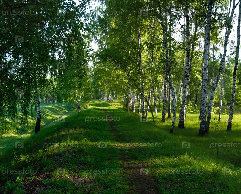 Солнечное утро, тенистая тропинка в березовом лесу. Россия