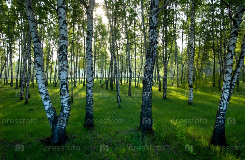 Солнечное утро в березовом лесу, стволы берез утопают в изумрудной траве. Россия