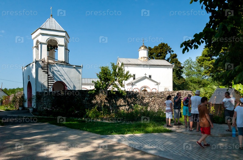 Белая колокольня, храм и паломники пьют воду из колодца. Церковь Георгия Победоносца 11 века. Очамчира, село Илор, Абхазия