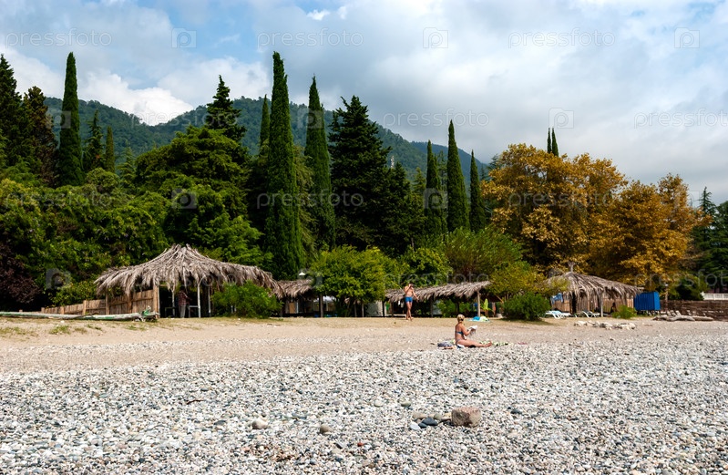 Берег и галечный пляж Черного моря в районе Нового Афона, Абхазия