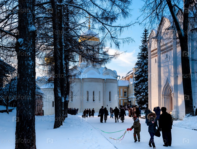 Троицкий собор в древнерусском стиле, высокие ели, мороз, Паломники, на святом месте. Сергиев Посад, Россия