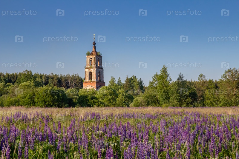 Заброшенная колокольня в цветущем поле. Колокольня Аргуновской Никольской церкви, место бывшего с.Аргуново, Петушинский район, Владимирская область