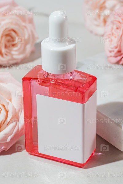 Концепция натуральной органической косметики. Уход за кожей (терапия), косметические товары в бутылочке-капельнице. пипетка с сывороткой среди нежных лепестков роз. Макет