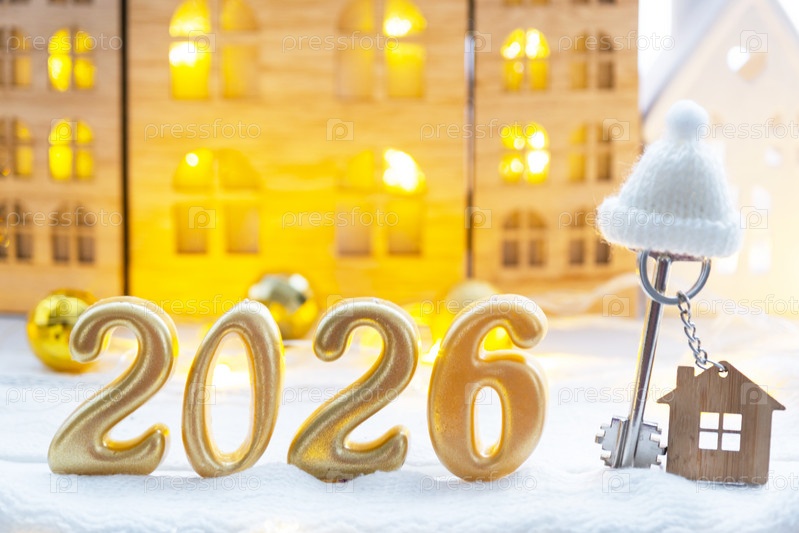 Золотые цифры номер 2026, ключ и крошечный дом на фоне уютных окон дома с теплым светом с праздничным декором из звезд, снега и гирлянд. Открытка с Новым годом, уютный дом