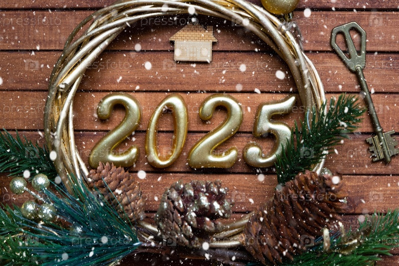 Новогодний ключ от дома с брелком-коттеджем на праздничном коричневом деревянном фоне с номером 2025 в венке, огнями гирлянд. Покупка, строительство, переезд, ипотека, страхование