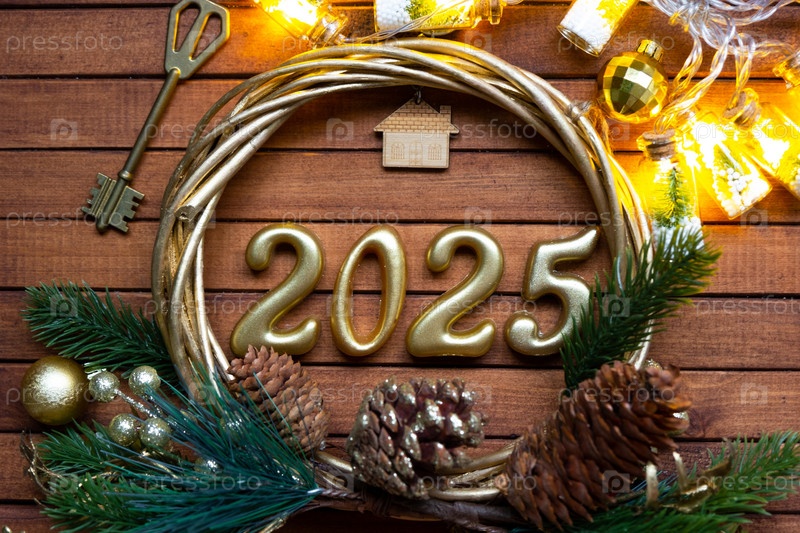 Новогодний ключ от дома с брелком-коттеджем на праздничном коричневом деревянном фоне с номером 2025 в венке, огнями гирлянд. Покупка, строительство, переезд, ипотека, страхование