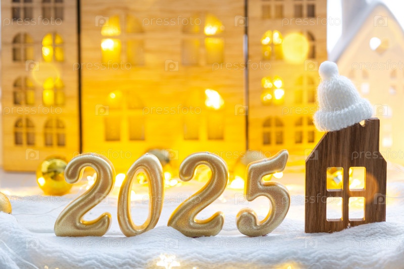 Золотые цифры номер 2025 и крошечный дом на фоне уютных окон дома с теплым светом с праздничным декором из звезд, снега и гирлянд. Открытка с Новым годом, уютный дом