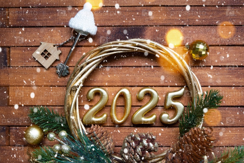 Новогодний ключ от дома с брелком-коттеджем на праздничном коричневом деревянном фоне с номером 2025 в венке, огнями гирлянд. Покупка, строительство, переезд, ипотека, страхование