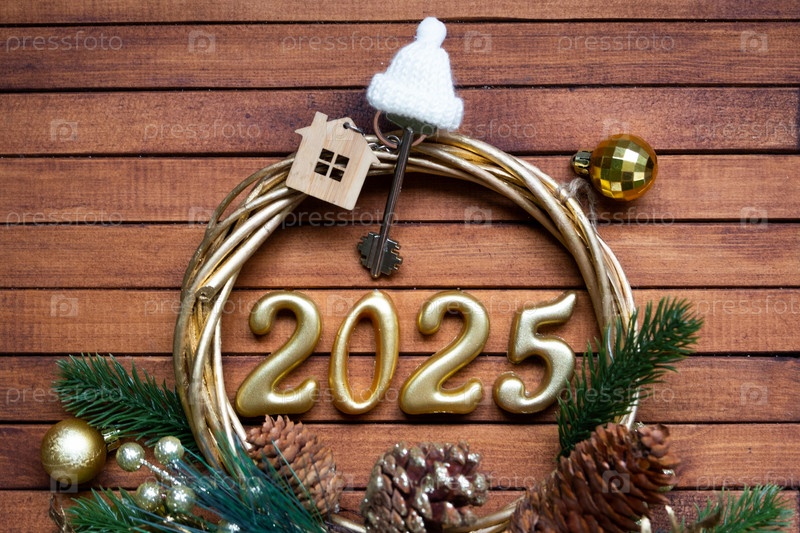 Новогодний ключ от дома с брелком-коттеджем на праздничном коричневом деревянном фоне с номером 2025 в венке, огнями гирлянд. Покупка, строительство, переезд, ипотека, страхование