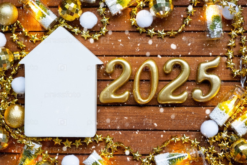 Ключ от дома с крошечной фигуркой дома макет на праздничном коричневом деревянном фоне, огни гирлянд. Деревянные буквы к Новому 2025 году, поздравительная открытка. Покупка, строительство, переезд, ипотека, страхование