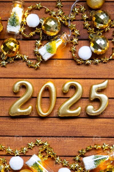 С Новым годом деревянные цифры 2025 на уютном праздничном коричневом деревянном фоне с блестками, снегом, огнями гирлянд. Привет, открытка. Календарь, обложка