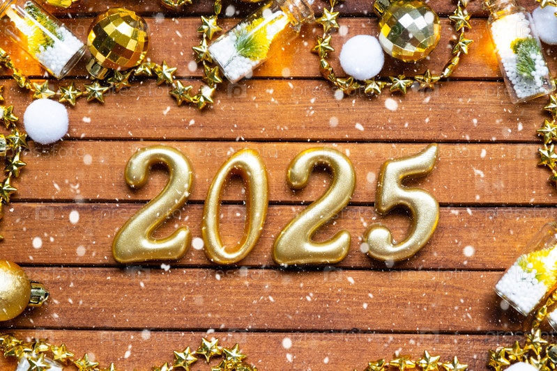 С Новым годом деревянные цифры 2025 на уютном праздничном коричневом деревянном фоне с блестками, снегом, огнями гирлянд. Привет, открытка. Календарь, обложка