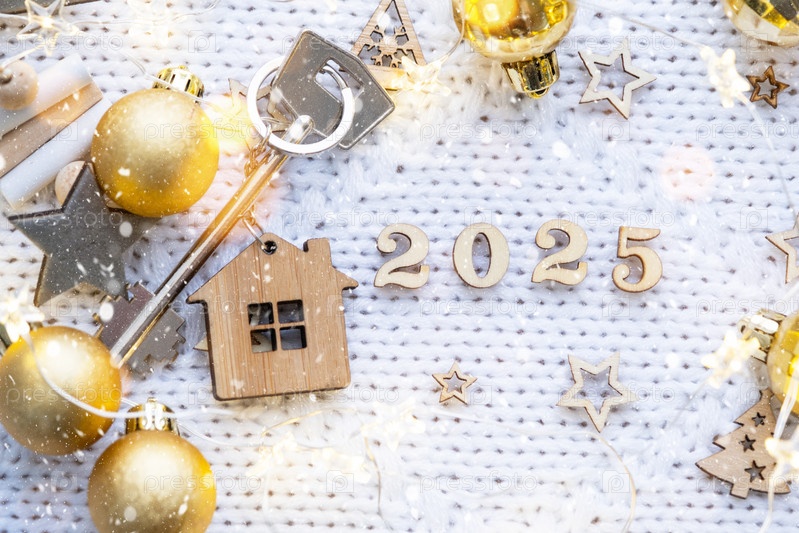 Ключ от дома с брелком коттедж на праздничном фоне со звездами, огнями гирлянд. Деревянные буквы к Новому 2025 году, поздравительная открытка. Покупка, строительство, переезд, ипотека, страхование
