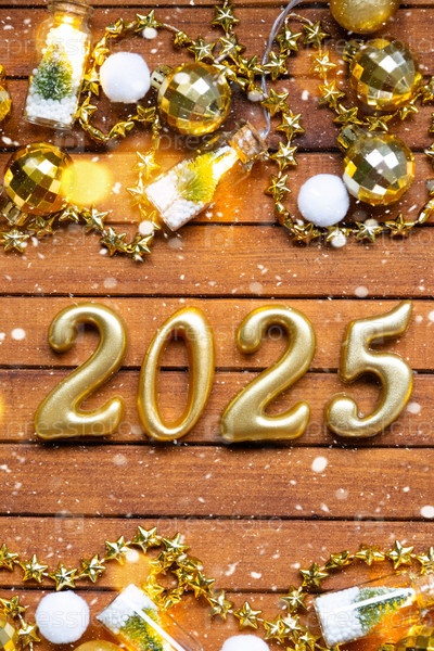 С Новым годом деревянные цифры 2025 на уютном праздничном коричневом деревянном фоне с блестками, снегом, огнями гирлянд. Привет, открытка. Календарь, обложка