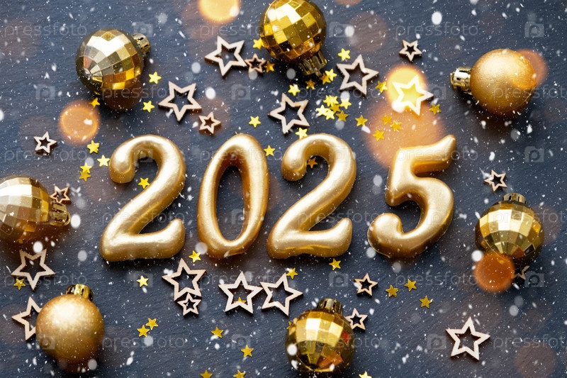 Золотые фигурки 2025 из свечей на фоне черного каменного сланца украшены праздничным декором из звезд, блесток, еловых веток, шаров и гирлянд. Открытка с Новым годом