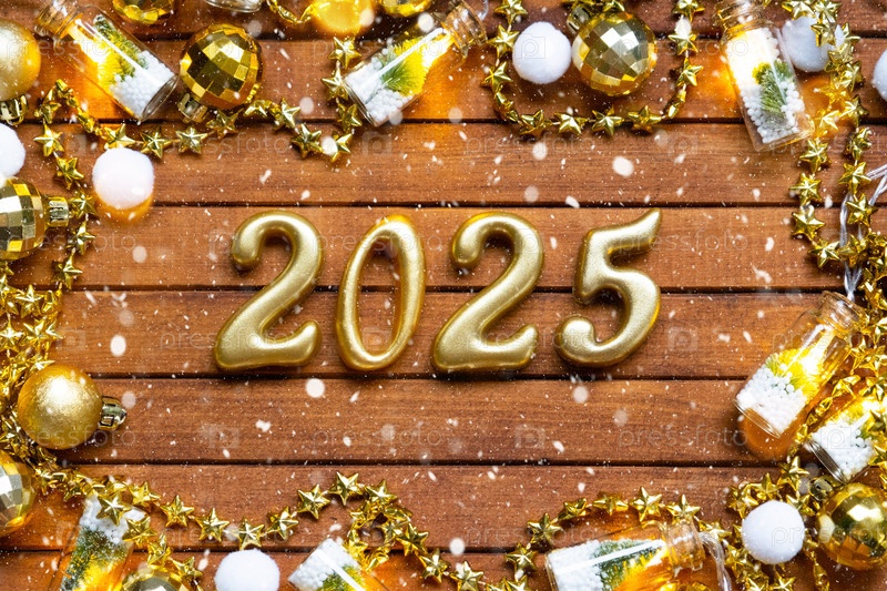 С Новым годом деревянные цифры 2025 на уютном праздничном коричневом деревянном фоне с блестками, снегом, огнями гирлянд. Привет, открытка. Календарь, обложка