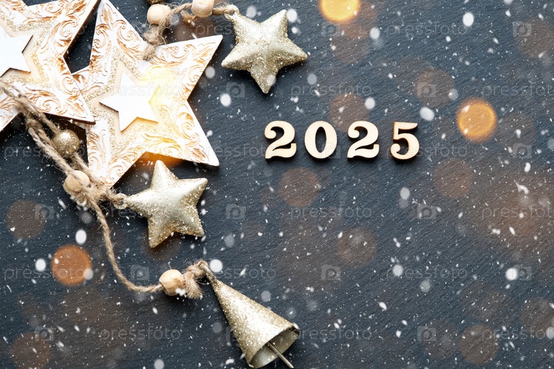 С Новым годом - деревянные буквы и цифры 2025 на праздничном черном фоне с блестками, звездами, снегом. Привет, открытка. Календарь, обложка