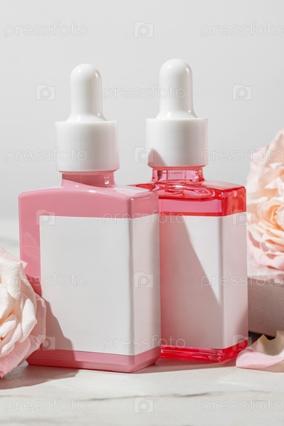 Набор для домашнего ухода за кожей и спа. Две бутылки косметической сыворотки на мраморном солнечном фоне с бутонами белых роз и тенями. Концепция естественного лечения
