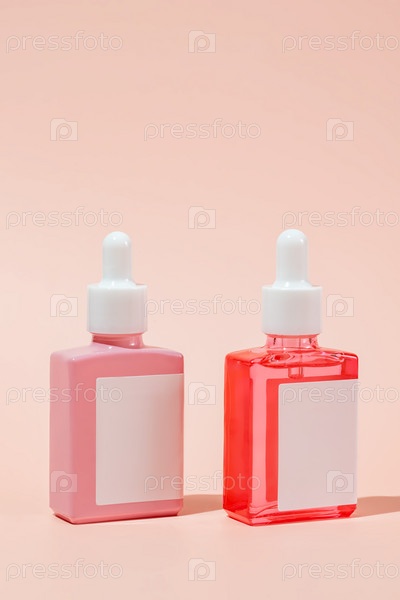 Две косметические бутылочки с пипеткой на розовом фоне, упаковка продукта с натуральным эфирным маслом, антивозрастная сыворотка с пептидами, косметический макет, концепция спа. Минимализм