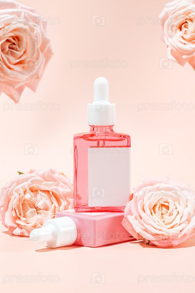 Сыворотка для лица в стеклянной бутылке-капельнице и розовые розы на персиковом фоне. Натуральная косметика по уходу за кожей. Концепция рутины красоты. Минимальный состав. Модный продукт для брендинга