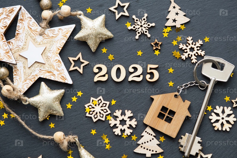 Ключ от дома с брелком коттедж на праздничном черном фоне со звездами, огнями гирлянд. Деревянные буквы к Новому 2025 году, поздравительная открытка. Покупка, строительство, переезд, ипотека, страхование