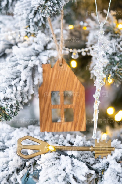Ключ и крошечный брелок для ключей от дома в руке на фоне волшебной елки. подарок на Новый год, Рождество. Строительство, проектирование, проект, переезд, страхование, ипотека, аренда и покупка недвижимости