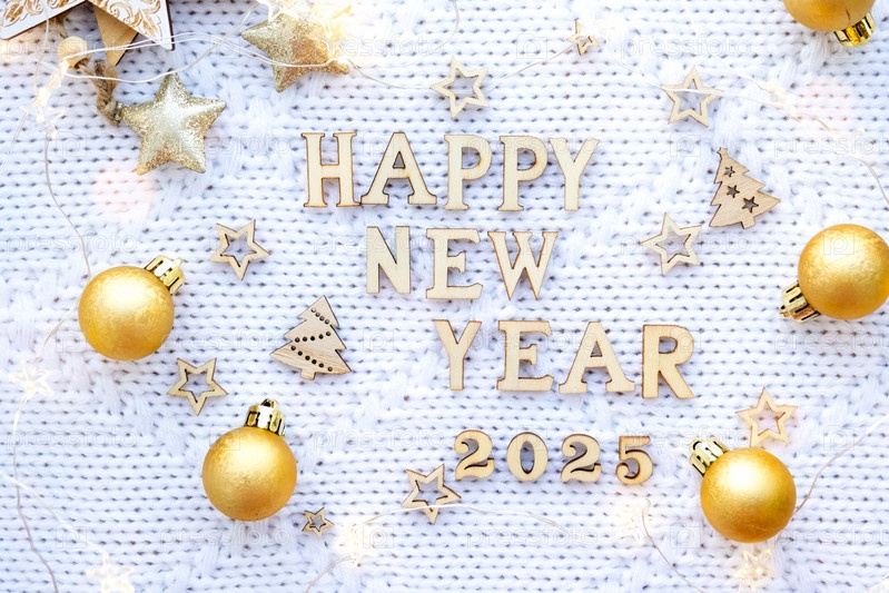С Новым годом деревянные цифры 2025 на уютном праздничном белом вязаном фоне с блестками, звездами, огнями гирлянд. Привет, открытка. Календарь, обложка