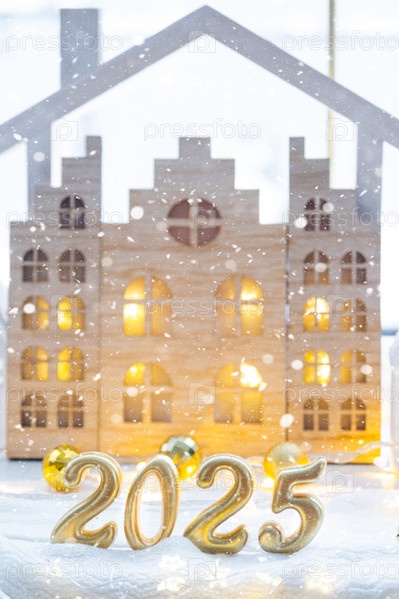 Золотые фигурки числа 2025 на фоне уютных окон дома с теплым светом с праздничным декором из звезд, снега и гирлянд. Открытка с Новым годом, уютный дом