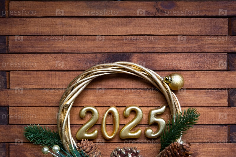 С Новым годом золотые цифры 2025 на уютном праздничном коричневом деревянном фоне с блестками, снегом, огнями гирлянд. Привет, открытка. Календарь, обложка