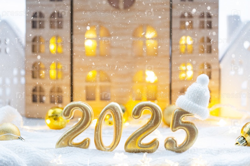 Золотые фигурки числа 2025 на фоне уютных окон дома с теплым светом с праздничным декором из звезд, снега и гирлянд. Открытка с Новым годом, уютный дом